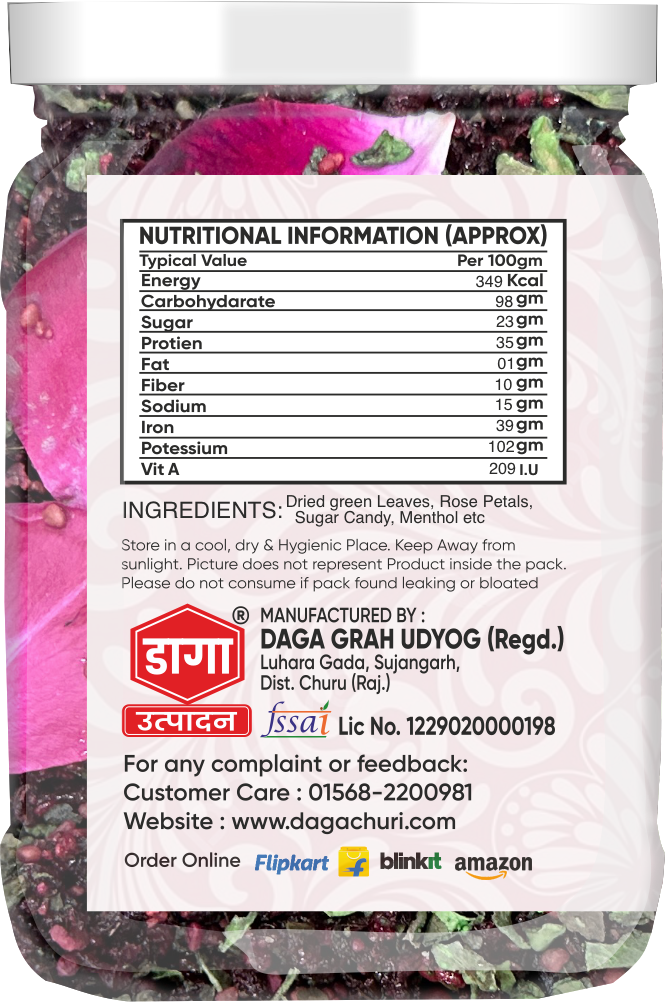 Gulkand Paan mouth freshener is a highly sought-after traditional Indian mukhwas that captures the essence of a classic sweet paan, with the star ingredient being gulkand – a preserve made from rose petals. This delightful blend typically features betel leaves (paan patti), gulkand, fennel seeds (saunf), dry dates, sugar, and sometimes additional aromatic elements like menthol, cardamom, or even silver leaves. Known for its intensely sweet, floral, and refreshing flavor profile, Gulkand Paan mouth freshener offers a cooling sensation and aids in digestion, making it a popular after-meal treat. It provides a luxurious and authentic taste of Indian tradition, often packaged to retain its freshness and rich aroma.