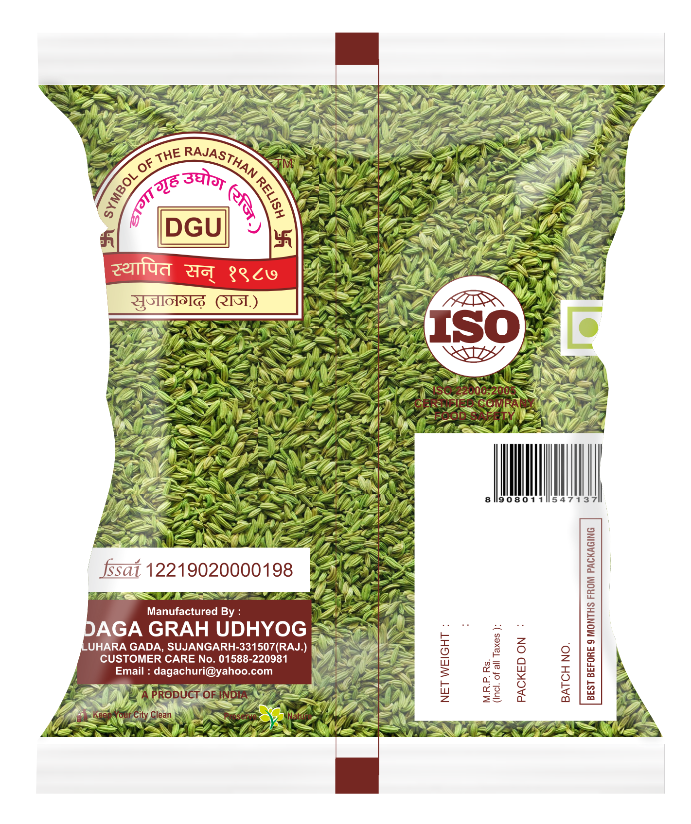 Sounf (Fennel Seeds) by Daga Grah Udyog presents 100% pure, naturally green seeds available in two particle size variants—small and large—to suit your specific culinary requirements. Thoroughly cleaned and sorted to remove all impurities, this fennel contains no added colors or preservatives, ensuring complete purity. Ideal for traditional Indian cooking, digestive preparations, and flavor enhancement in both sweet and savory applications.